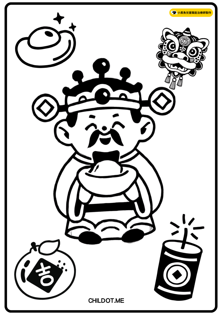 🎨 新年著色學習單:財神、舞獅與大吉大利,訓練手部小肌肉穩定度與運筆控制 。