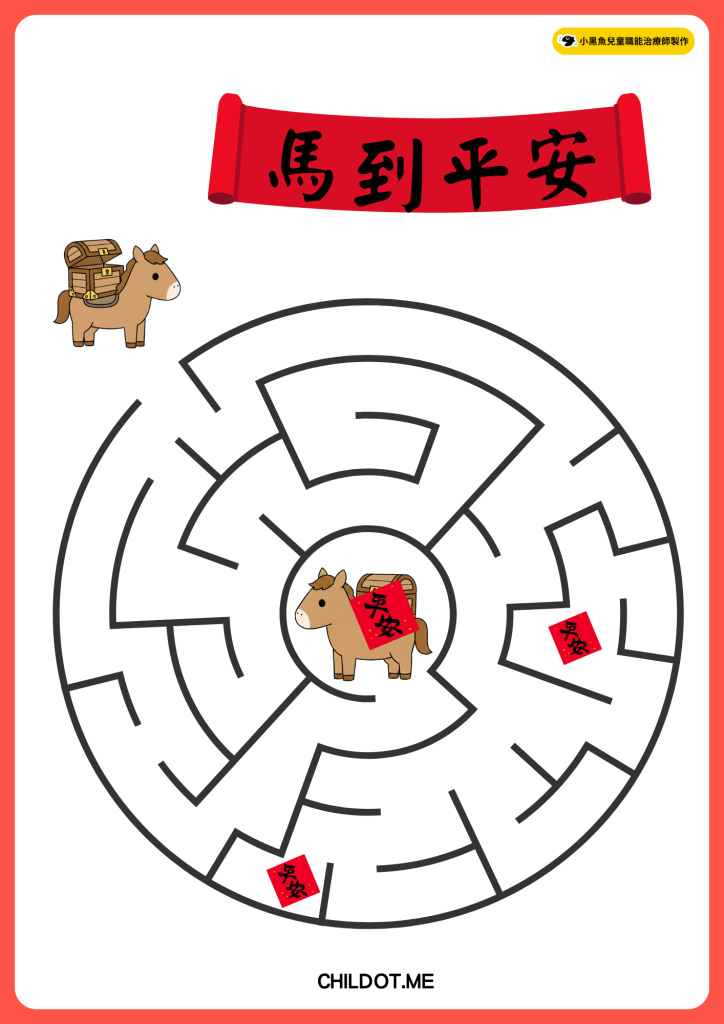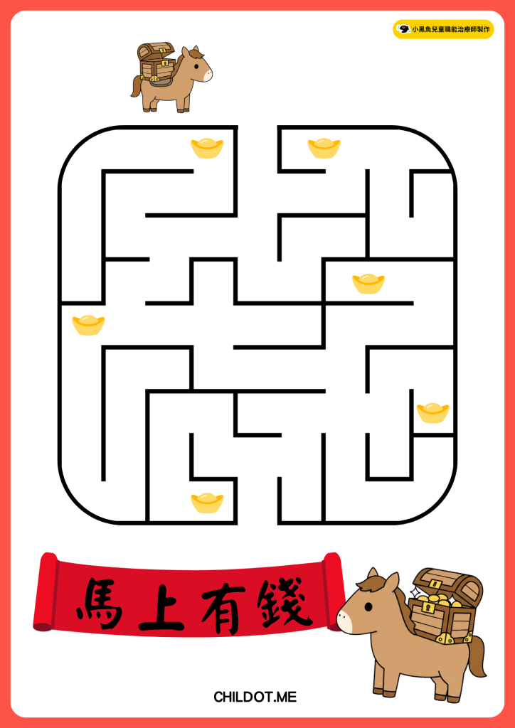 🐎 馬上尋寶迷宮:挑戰「馬上有錢」與「馬上幸福」迷宮,練習視知覺整合,幫小馬找回寶箱裡的元寶與愛心 。
