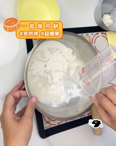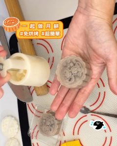 ● 製作重點:壓模時,需輕輕將麵糰放入模型中,固定後先輕壓2-3次,再下壓停留約五秒,推出即完成冰皮月餅🥮囉!